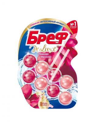 Бреф Делюкс — подвесной туалетный блок для унитаза с технологией Перфюм Перлс для более длительного и интенсивного аромата! Формула с технологией Перфюм Перлс действует в 4 направлениях: придает изысканный аромат туалету благодаря премиальной отдушке; образует очищающую пену, которая обеспечивает гигиеническую чистоту при каждом смывании; предотвращает образование известкового налета; помогает предотвратить повторное загрязнение; Бреф Делюкс — парфюмерный аромат для Вашего туалета. Характеристики: Вес: 50 г. Количество: 2 шт. Цвет: розовый, фуксия. Аромат: нежная магнолия.