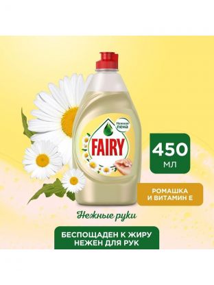 Fairy «Нежные руки: ромашка и витамин Е» — высокоэффективное средство, которое прекрасно подходит для мытья посуды и кухонной утвари. Оно хорошо удаляет различные загрязнения и жир, придаёт предметам сияющий блеск и устраняет стойкие неприятные запахи. Экстракт ромашки и витамин Е защищают и увлажняют кожу рук, при этом не вызывая на ней раздражения. Средство отличается густой консистенцией, что гарантирует его экономный расход. Fairy - безопасный продукт, разработанный в европейском научно-исследовательском центре (Brussels Innovation Centre) и полностью соответствующий ГОСТу РФ. Состав: анионные ПАВ (5–15 %), амфолитные ПАВ (менее 5 %), консервант (молочная кислота), отдушки. Объем 450 мл. Основные преимущества: Отмывает в 2 раза больше посуды; Быстро справляется с засохшим жиром; Мягкий для рук; Полностью смывается водой.
