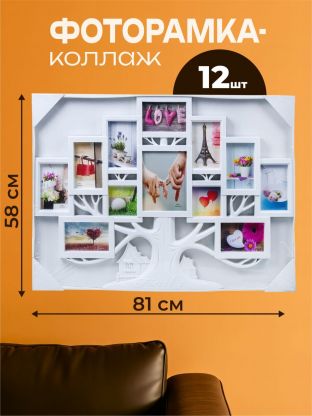 Фоторамка-коллаж на 12 фото, 58х81 см, пластик, 9 фото 10х15 см, 1 фото 15х20 см, 2 фото 10х10 см, Y4-3884