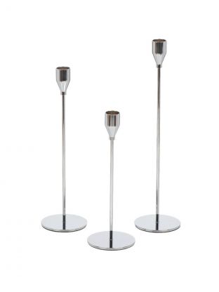 В комплекте три подсвечника высотой 23, 27 и 32 см, диаметр отверстия под свечу — 2 см, цвет — серебристый.