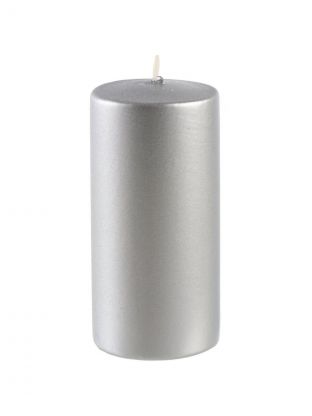 Высота изделия — 15 см, диаметр — 7 см. Форма — цилиндрическая, цвет — серебро. В упаковке 1 свеча.