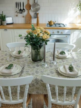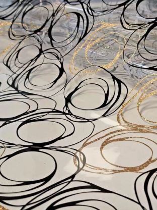 Да, благодаря прозрачному фону и золотому декору клеёнка гармонирует с любой посудой и текстилем, создавая праздничный акцент.