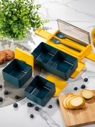 Трёхуровневый пищевой контейнер 8x20x11 см с приборами: удобно брать еду с собой, экономьте время и сохраняйте свежесть продуктов.