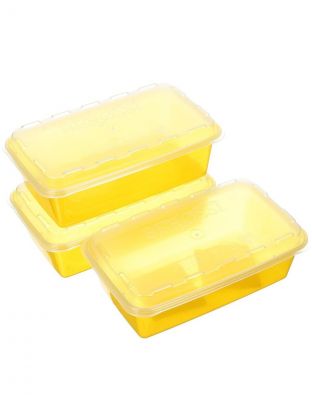 В наборе три прямоугольных контейнера объёмом по 1 литру, высота каждого — 9,5 см. Цвет — лимонный, материал — пластик, крышка также пластиковая.
