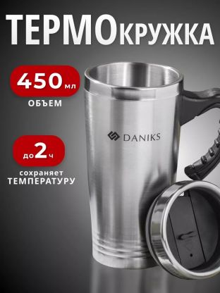 Термокружка Daniks 0.45 л из нержавеющей стали: держит тепло и холод до 2 часов, прочная, подходит для авто и города. Недорого — удобно каждый день!