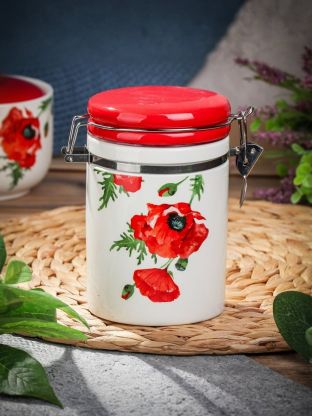 Объем — 0.8 литра, материал — керамика с глазурью, крышка с бугельным замком. Банку можно мыть вручную или в посудомоечной машине, что облегчает уход.