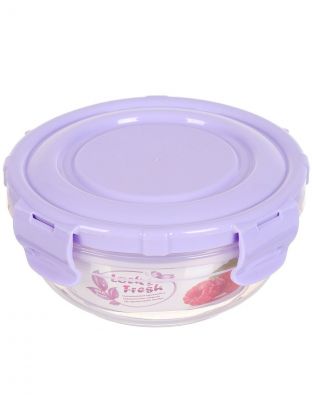 Объём — 0.4 литра, размеры: длина 13,2 см, ширина 13,2 см, высота 6,8 см. Круглая форма, цвет сиреневый.