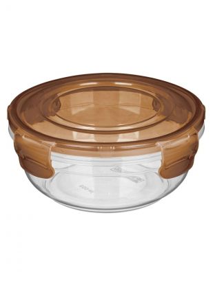 Контейнер круглый, объём 0.8 литра, материал — прочный пластик, цвет — коричневый. Отлично помещается в стандартных холодильниках и сумках для обедов.