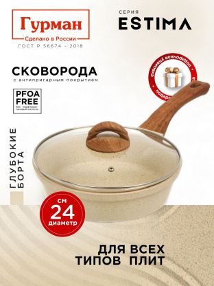 Покупайте сковороду 24 см Гурман Estima недорого для дачи или дома — получите надежную посуду с гарантией 36 месяцев и бесплатной доставкой при заказе онлайн.