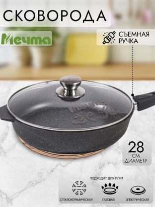 Сковорода Мечта Гранит black 28 см: литой алюминий, антипригарное покрытие, крышка и съемная ручка — решение для вкусных и здоровых блюд без пригорания.