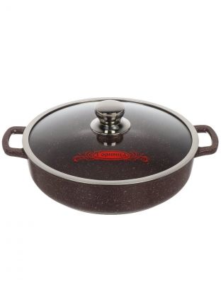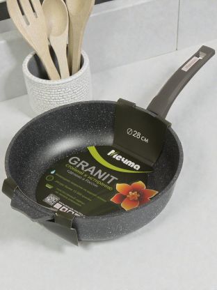 Также в ней можно приготовить плов рагу, жаркое или даже испечь пирог. «Гранит». Коллекция посуды с улучшенным четырёхслойным антипригарным покрытием. Дополнительный слой с мраморным эффектом увеличивает износостойкость и создаёт оригинальный оттенок чёрного мрамора. Литой пищевой алюминий не имеет канцерогенных веществ и посторонних запахов. Толстые стенки и дно обеспечивают равномерное приготовление блюда.