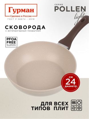 Сковорода литой алюминий 24 см Гурман Pollen light — идеальное решение для индукции и всех типов плит: антипригарное покрытие PFLUON, срок службы до 5 лет, универсальность для любой кухни.