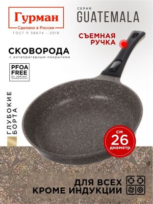 • Прочный литой алюминий, диаметр 26 см, утолщённое дно 4 мм — равномерный нагрев и долгий срок службы