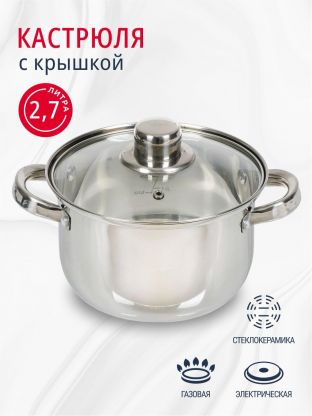Кастрюля нержавеющая сталь, 2.7 л, крышка стекло, DNN3, SD-A17-18