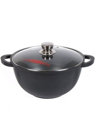 Казан объемом 4,4 л с антипригарным покрытием изнутри и краской черного цвета снаружи, с не нагревающимися ручками из нержавеющей стали.