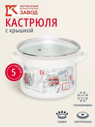 Кастрюля эмалированная 5 л с прочной стеклянной крышкой от Керченского металлургического завода — оптимальный выбор для семьи: готовьте супы, каши, пельмени без хлопот.