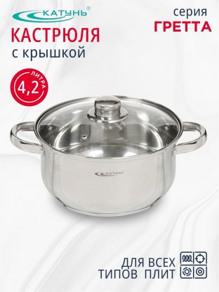 Кастрюля из нержавеющей стали 4.2 л Катунь Гретта — универсальное решение для дома и дачи: подходит для всех плит, безопасная стеклянная крышка, оптимальный объём для семьи.