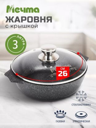 Кастрюля Мечта Гранит black Induction Pro на 3 литра — это современный выбор для тех, кто ищет, какую кастрюлю купить недорого для дачи или кухни с индукционной плитой. Благодаря толстому 7-миллиметровому дну и инновационному гранитному антипригарному покрытию, блюда не пригорают, а тепло распределяется равномерно. Стеклянная крышка с выпускным клапаном позволяет контролировать процесс приготовления без лишнего пара, что особенно важно для супов и каш.