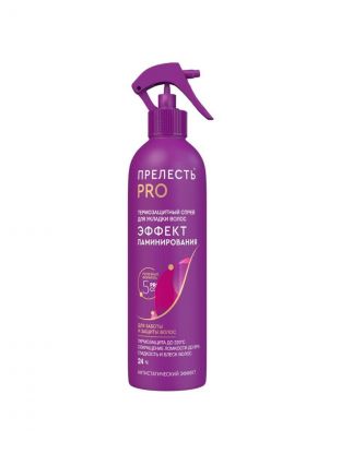 Спрей для укладки волос Эффект ламинирования от Прелесть Professional придает гладкость и здоровый блеск волосам до 24 часов. Эффект прямых волос и блеск! Спрей защищает от теплового воздействия. Идеален при применении утюжка для разглаживания волос. 100% контроль над укладкой при любых погодных условиях. 100% контроль над пушением – снимает статическое электричество. Не склеивает пряди и не оставляет липких следов на волосах. Благодаря обновленной формуле с марокканским аргановым маслом и микропротеинами пшеницы укрепляет и восстанавливает волосы изнутри, снижает ломкость волос. В состав всех средств для укладки волос Прелесть Professional включен комплекс DiProFactor, который сочетает в себе современные фиксирующие компоненты и витамины, благодаря чему обеспечивается двойной усиленный эффект – длительная естественная фиксация без склеивания волос и защита прически в любых климатических условиях. Способ применения: Перед употреблением встряхнуть. Равномерно нанести спрей с расстояния примерно 20 см на влажные волосы. Расчесать волосы и сделать укладку. Не смывать.