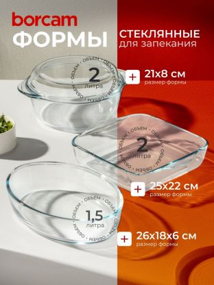 Набор жаропрочной посуды Borcam 3 шт: стекло, овальная форма, крышка — для духовки, СВЧ, посудомойки. Идеально для запекания и сервировки. Почему выбирают: Стекло Borcam выдерживает резкие перепады температур и не впитывает запахи — безопасно для здоровья Три формы разного объёма (2 л, 2 л, 1,5 л) с крышкой — удобно для запекания курицы, рыбы, выпечки Многофункциональность: подходит для дома, дачи, подарка, легко мыть в посудомоечной машине Набор жаропрочной посуды Borcam из 3 предметов — идеальное решение для тех, кто ищет, какую посуду выбрать для духовки и микроволновки. Овальные формы из прочного стекла (объём 2, 2 и 1,5 литра) подходят для запекания курицы, рыбы, куличей и других блюд. Крышка в комплекте помогает сохранять сочность и аромат, а прозрачный материал позволяет контролировать процесс готовки без открытия. Многие спрашивают, чем отличается стеклянная жаропрочная посуда от металлической или керамической. Стекло Borcam не вступает в реакцию с продуктами, не окрашивается и не впитывает запахи, что особенно важно для аллергиков и семей с детьми. Формы подходят для использования в СВЧ и духовке, их можно мыть в посудомойке, что экономит время. В отличие от аналогов без крышки, этот набор сохраняет свежесть блюда дольше. Как использовать набор? Просто выберите подходящий размер формы, поместите продукты, накройте крышкой и отправьте в духовку или микроволновку. Благодаря овальной форме посуда занимает минимум места на полке и в холодильнике. Закажите набор Borcam прямо сейчас — получите универсальную посуду для любых блюд, которая прослужит долгие годы. Бесплатная доставка и гарантия оригинальности товара. Частые вопросы: Можно ли использовать эти формы для выпечки хлеба и куличей? Да, набор включает формы объёмом 2 и 1,5 литра, которые отлично подходят для выпечки хлеба, куличей, запекания мяса и рыбы. Стекло выдерживает высокие температуры и не трескается при перепадах. Подходит ли для мытья в посудомоечной машине и использования в микроволновке? Да, посуда Borcam совместима с посудомойкой и СВЧ. Это экономит ваше время и упрощает уход за формами. Какой размер у самой большой формы в наборе? Максимальный объём — 2 литра, диаметр 21 см, высота 8 см. Все формы овальные, что удобно для запекания целой курицы или крупной рыбы.