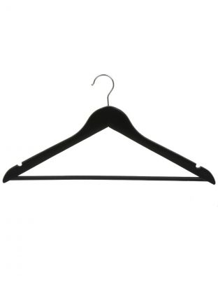 Вешалка черного цвета выполнена из пластика с покрытием флок. Вешалки очень легкие. Вешалки с флокированным покрытием позволяют даже шелковым вещам не скользить. Такие вешалки экономят пространство в гардеробе благодаря плоской форме. Вешалки имеют выемки на плечиках.