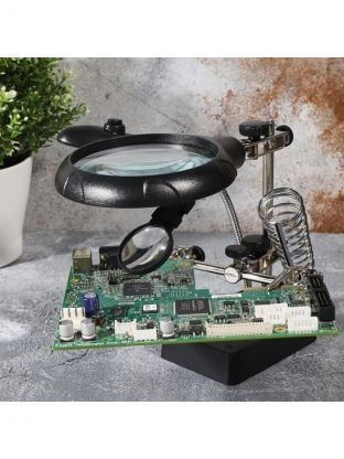 Держатель с подставкой "Третья рука" — незаменимый помощник для любителей электроники, ювелирного дела, сборки и ремонта мелких деталей. Устройство сочетает в себе надежную подставку, шарнирное соединение с удобными зажимами типа «крокодил», а также три лупы с разным увеличением: 2.5x (90 мм), 7.5x (34 мм) и 10x (34 мм). Благодаря продуманной конструкции, держатель позволяет надежно зафиксировать даже самые мелкие детали, обеспечивая максимальную точность и комфорт при работе.