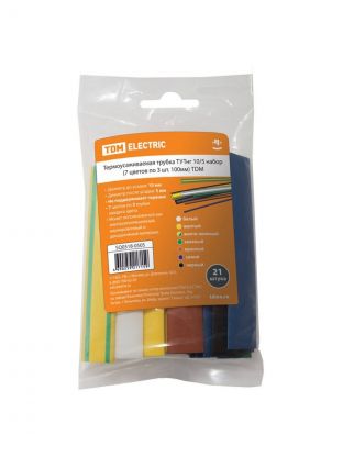 Термоусадочная трубка 10/5 мм, 21 шт, набор, 7 цветов по 3 шт, 100 мм, TDM Electric, SQ0518-0505