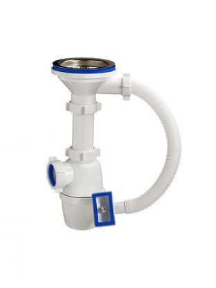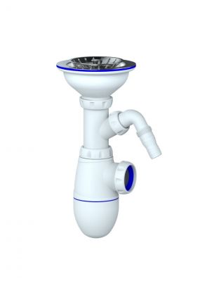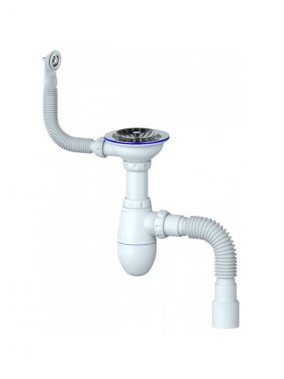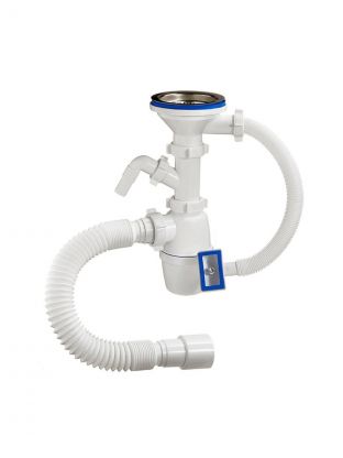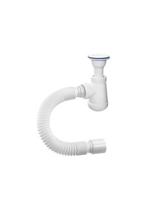 В комплекте идёт пластиковая чашка диаметром 70 мм. Сифон комплектуется нержавеющим винтом длиной 75 мм и нержавеющей гайкой. Конструкция выпуска литая. Гибкий отвод позволяет подключить слив сифона к канализации с диаметрами 50 мм.