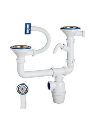 Сифон с большим корпусом и отстойником, нержавеющими чашками 114 мм для двойной разноуровневой мойки с круглым или прямоугольным переливом, одним отводом для слива от стиральной машины. В комплекте так же идут две прокладки на прямоугольный перелив - прямоугольная на квадратную форму мойки и полукруглая на круглую. Необходим отвод в канализацию.