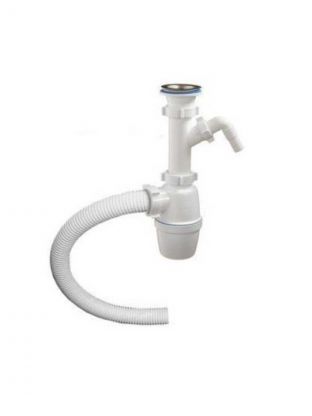 Бутылочный сифон выглядит как бутылка с горизонтальным ответвлением. Для подключения этой конструкции необходимо немного свободного пространства. Вода, которая находится в колбе, предупреждает проникновение канализационных запахов в помещение.