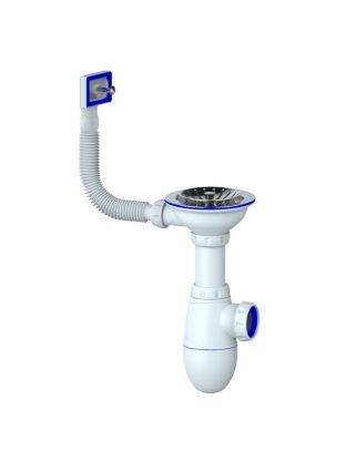 Сифон с большим корпусом и отстойником, литым выпуском и нержавеющей чашкой диаметром 70мм, одним отводом и гибкой трубой 40-40/50 для раковины или мойки.