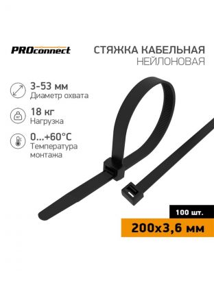 Хомут стяжной кабельный, 3.6х200 мм, нейлон, 100 шт, черный, PROconnect, 57-0201