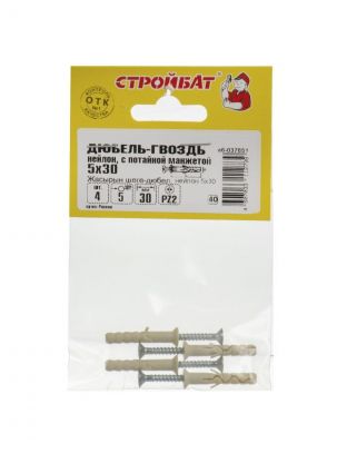 Дюбель-гвоздь нейлон, диаметр 5х30 мм, 4 шт, потайной, Стройбат, 37651