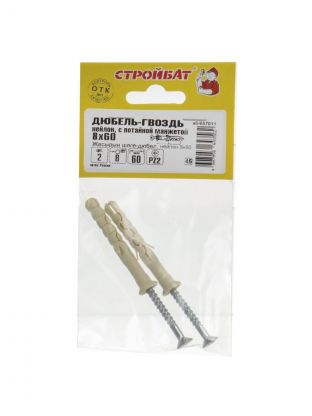 Дюбель-гвоздь нейлон, диаметр 8х60 мм, 2 шт, потайной, Стройбат, 57011