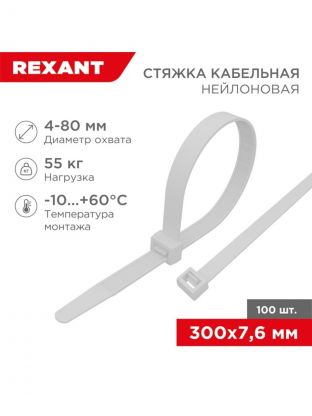 Хомут стяжной кабельный, 7.6х300 мм, нейлон, 100 шт, белый, Rexant, 07-0302