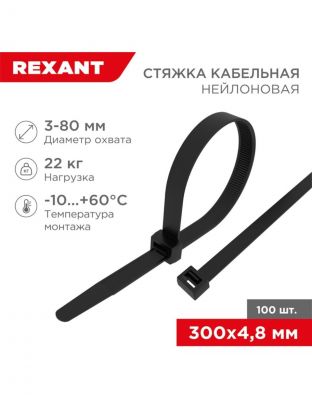 Хомут стяжной кабельный, 4.8х300 мм, нейлон, 100 шт, черный, Rexant, 07-1303