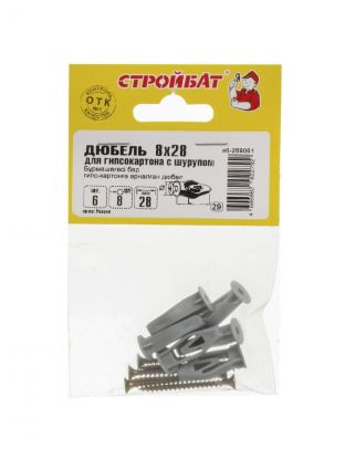 Идеальное решение для крепления легких конструкций в листовые материалы! Дюбель для гипсокартона диаметром 8х28 мм с саморезом от бренда Стройбат обеспечит надежное крепление в гипсокартоне, фанере и ДСП. Комплект из 6 штук, изготовленный из прочного полипропилена, гарантирует долговечность и простоту использования.