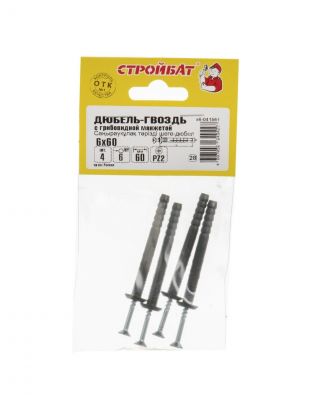 Дюбель-гвоздь полипропилен, диаметр 6х60 мм, 4 шт, грибовидный, Стройбат, 41561