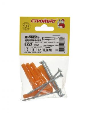 Дюбель универсальный, сталь, полипропилен, диаметр 8х52 мм, 5 шт, с саморезом 5x70, Стройбат, 46131