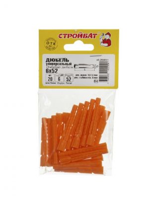 Дюбель универсальный, полипропилен, диаметр 6х52 мм, 20 шт, Стройбат, 269851