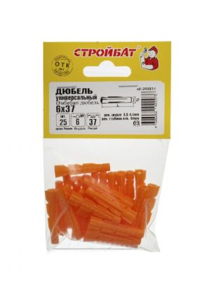 Дюбель универсальный, полипропилен, диаметр 6х37 мм, 25 шт, Стройбат, 269831