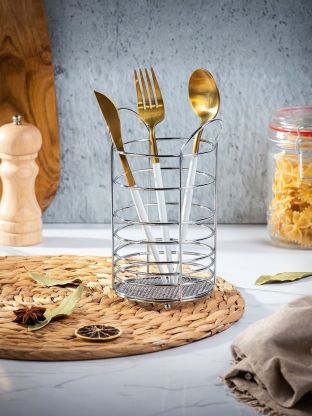 Обратите внимание на материал (металл с хромированным покрытием устойчив к влаге), размеры (18х10 см — оптимально для стандартного набора приборов), а также форму (круглая подставка легко размещается на столе или кухонной полке).