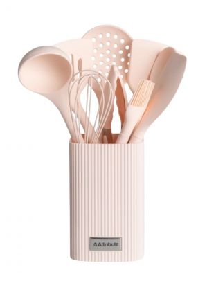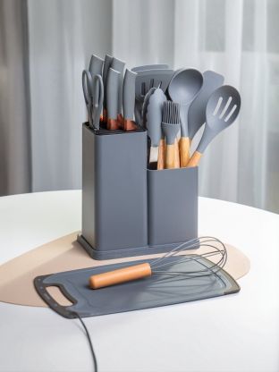 В комплекте 6 предметов: 5 ножей (шеф, разделочный, овощной, универсальный, хлебный) и подставка из пластика. Все ножи изготовлены из нержавеющей стали, рукоятки — пластиковые.