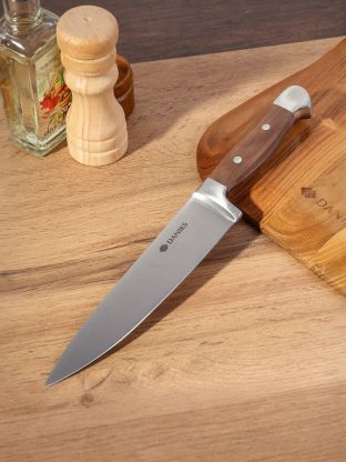 Рукоятка из дерева не только придает ножу элегантный вид, но и обеспечивает комфортный и надежный хват. Это особенно важно при длительной работе, когда требуется максимальная точность и контроль. Классический дизайн и эргономичность делают этот нож не только функциональным, но и эстетически привлекательным дополнением к любой кухне.