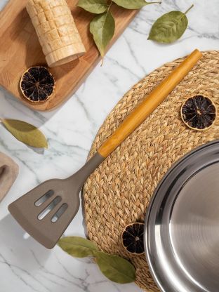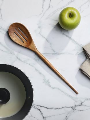 Экологичная ложка из массива акации — не царапает антипригарное покрытие, устойчива к влаге и запахам.