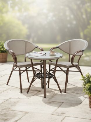 Если вы сравниваете, что лучше для обеда на открытом воздухе — раздельные элементы или готовый комплект, Амани выигрывает за счет полной комплектации и универсального размера. Столешница 130x75 см и стулья 43x46x80 см обеспечивают комфорт для компании из четырех человек, а отсутствие подушек облегчает уход за мебелью.