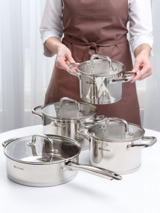 Набор посуды нержавеющая сталь, 8 предметов, кастрюли 2.1,2.9,5.1 л, сковорода 3.1 л, индукция, Daniks, Рейн
