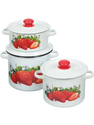 Набор посуды эмалированная сталь, 6 предметов, цилиндрические кастрюли 2 л, 3.5 л, 5.5 л, Сибирские товары, Клубника садовая 16, N16B59, белый