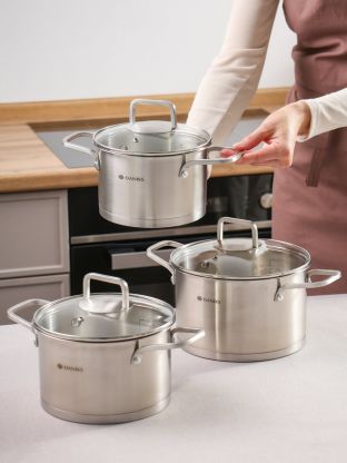 Набор кастрюль Daniks Лайнс 6 предметов: нержавеющая сталь 201, стеклянные крышки, подходит для индукции, идеален для дома и дачи. Почему выбирают: Профессиональный набор кастрюль с мерными делениями и клапаном — удобно готовить любые блюда Объемы 1.9, 2.9, 3.9 л, корпус из нержавеющей стали 201, стеклянные крышки, срок службы более 5 лет Универсальный вариант: для дома, дачи, подарка — подходит для всех типов плит, включая индукцию Набор посуды Daniks Лайнс SD-072-6 — это практичное решение для тех, кто ищет, какую кастрюлю выбрать для ежедневной готовки. Нержавеющая сталь 201 безопасна для пищи, устойчива к коррозии и не впитывает запахи. Стеклянные крышки с паровым клапаном позволяют контролировать процесс приготовления, а мерные деления внутри экономят время и ингредиенты. В отличие от алюминиевых или эмалированных аналогов, этот набор кастрюль не боится посудомоечной машины и легко выдерживает частую смену температур. Подходит ли для индукционных плит? Да, дно рассчитано на все типы конфорок: газ, стеклокерамика, индукция, галоген, электричество. Как использовать для варки борща, каши или компота? Просто выбирайте нужный объем — 1.9, 2.9 или 3.9 литра — и готовьте без ограничений. Если сравнивать с наборами с антипригарным покрытием, нержавейка долговечнее и не требует особого ухода. Ищете, что лучше для дачи или подарка на новоселье? Daniks Лайнс — универсальный выбор, который прослужит долго и не потеряет внешний вид. Гарантия 12 месяцев и удобная комплектация делают покупку выгодной и безопасной. Оформите заказ на набор кастрюль Daniks Лайнс — получите выгодную цену, быструю доставку и уверенность в качестве посуды для любых кулинарных задач. Частые вопросы: Можно ли использовать этот набор кастрюль на индукционной плите? Да, набор Daniks Лайнс SD-072-6 совместим с индукционными плитами, а также газовыми, электрическими, галогеновыми и стеклокерамическими. Дно адаптировано под все современные типы конфорок. Чем выгоден набор из нержавеющей стали для дачи или подарка? Нержавеющая сталь 201 устойчива к коррозии, не впитывает запахи, легко моется (можно мыть в посудомоечной машине). Универсальные объемы подходят для разных блюд и сценариев: дом, дача, подарок. Сколько предметов и какие объемы в наборе? В комплекте 6 предметов: три кастрюли объемом 1.9, 2.9 и 3.9 литра, три стеклянные крышки с клапаном. Все кастрюли оснащены мерными делениями для точного дозирования жидкости.