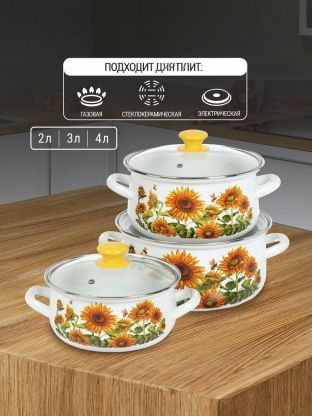 Набор посуды эмалированная сталь, 3 предмета, кастрюли 2,3,4 л, Керченский металлургический завод, Подсолнечный-1-ЭКСТРА
